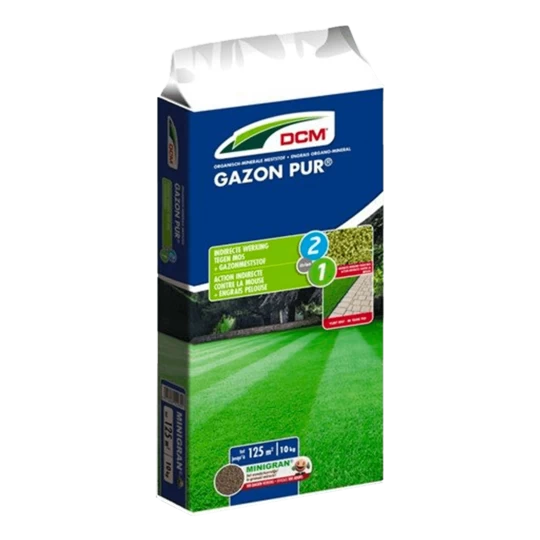 Meststof en mosdoder in 1: wat een minigran wel niet allemaal kan. Mosgroei in het gazon is een groot en veelvoorkomend probleem. Vaak komt dit doordat de bodem te zuur is. Wanneer een bodem te zuur is, groeit het gras slecht en hierdoor krijgt mos de kans om te groeien. Mos groeit goed op een zure bodem – dit wilt u natuurlijk voorkomen! Om mos te voorkomen strooien veel mensen vroeg in het voorjaar DCM Groenkalk. De perfecte volgende bemesting is de Gazon Pur: Een meststof en mosdoder in 1. De mosdeeltjes in het gazon zullen afsterven wanneer u Gazon Pur strooit. Daarnaast bevat de Gazon Pur de juiste voedingsstoffen voor een dichte hergroei en een donkergroen gazon. De DCM Gazon Pur is een organische meststof en heeft een lange nawerking van maar liefst 100 (!) dagen.